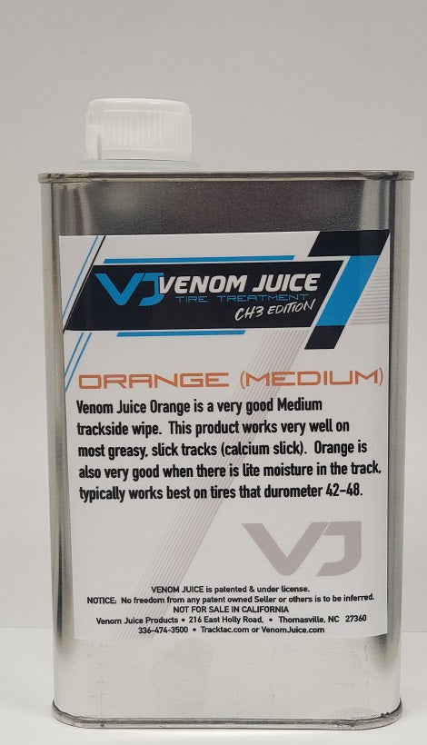 Venom Juice Medium is a very good Track Side Wipe. This product works very well on most greasy, slick tracks(calcium slick). Medium is also very good when there is lite moisture in the track, typically works best on tires that durometer between 42-48.