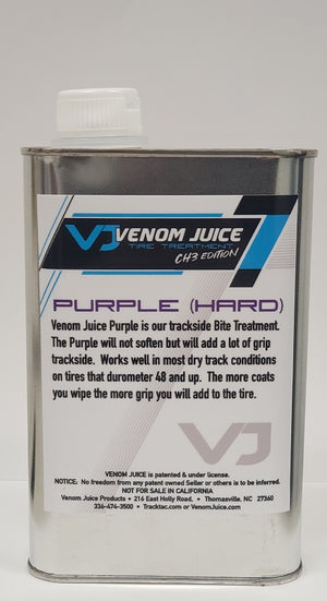 Venom Juice Hard is our Track Side Bite Treatment. The Hard will not soften but will add a lot of grip track side. Works well in most dry track conditions on tires that durometer 48 and up. The more coats you wipe the more grip you will add to the tire.