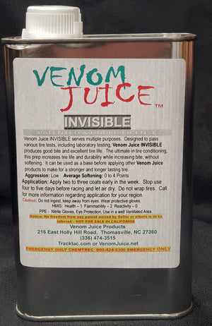 The Invisible is our best product for internally rolling stock car tires as well as EL tires. The Invisible will not only condition from the inside but will give the tire more flex and side bite. Invisible does not soften and will pass the durometer and sniffer test. We recommend you only roll the inside of the tire one time for the life of the carcass. Invisible is also good for adding to the fast drying internal preps on the market to help prolong the tire from drying out.
